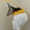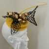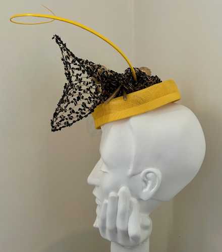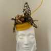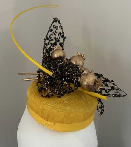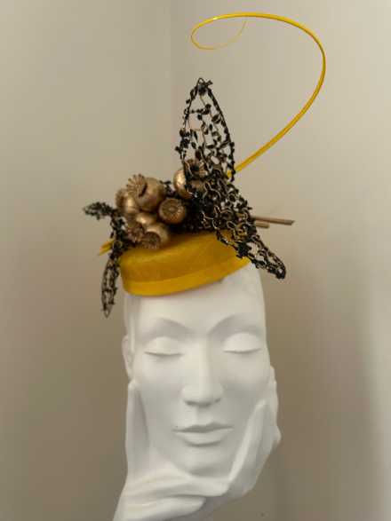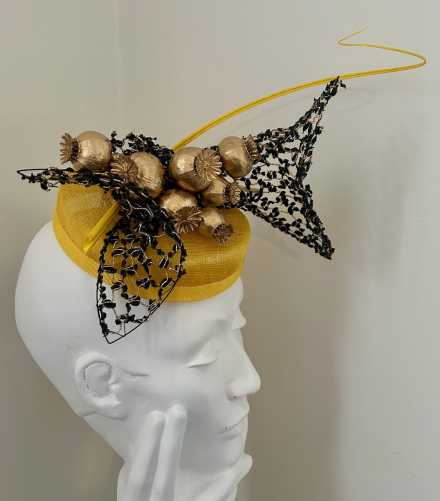 Forget me not I grew the poppies in my garden in Western Victoria. It is a symbol for the ever changing weather conditions that challenge us in the world we live in. Life is not as we knew it. Composition of sinamay, vintage veiling, poppy pods, petersham, wire, elastic, a metal comb and an ostrich quill.