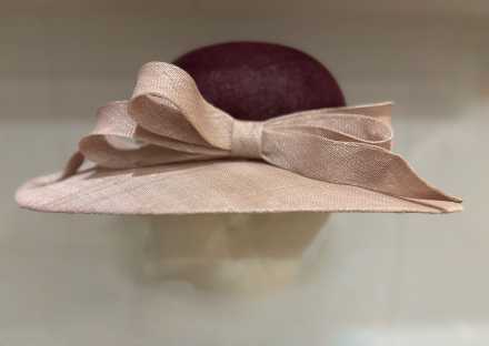 This sinamay sun hat in plum and lavender/pink suitable for lady’s day at the races or a dressy hat for every day. Suits head size 57cms.