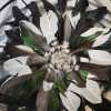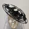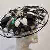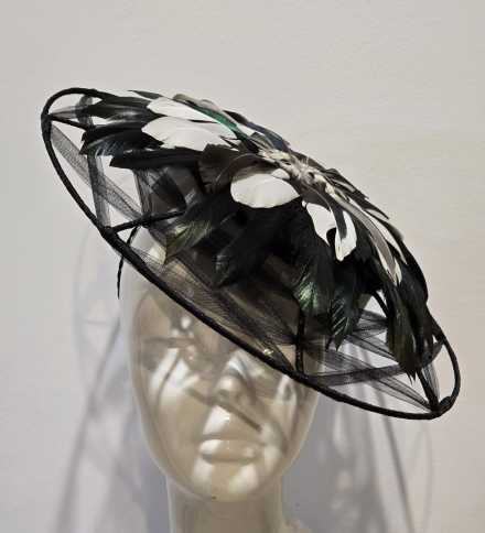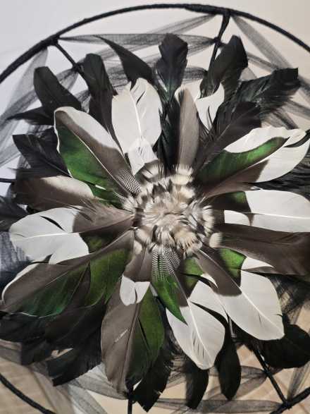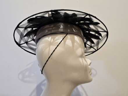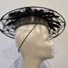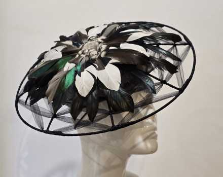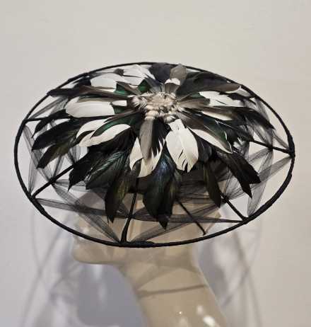 This piece is a felt button with a wired brim, embellished with irredescent duck feathers.