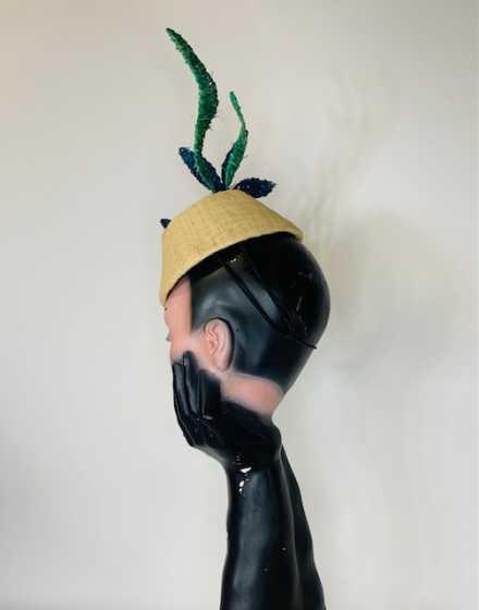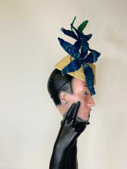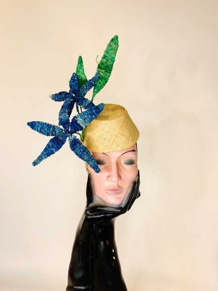 Raffia covered headpiece trimmed with natural raffia flowers. Suitable for:  Emirate Stakes Day, Headpieces, Melbourne Cup Day, Oaks Day, Race Day, Women.