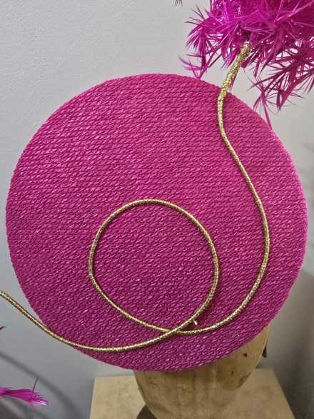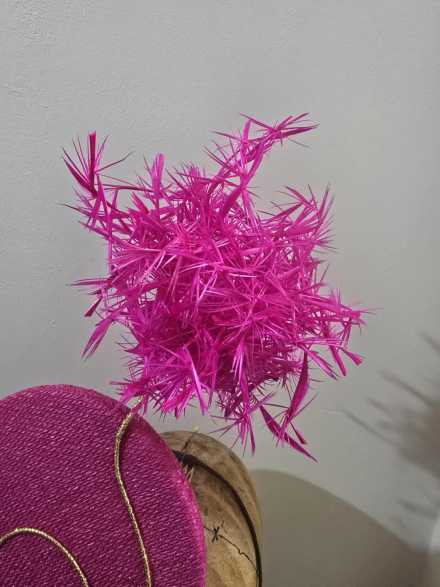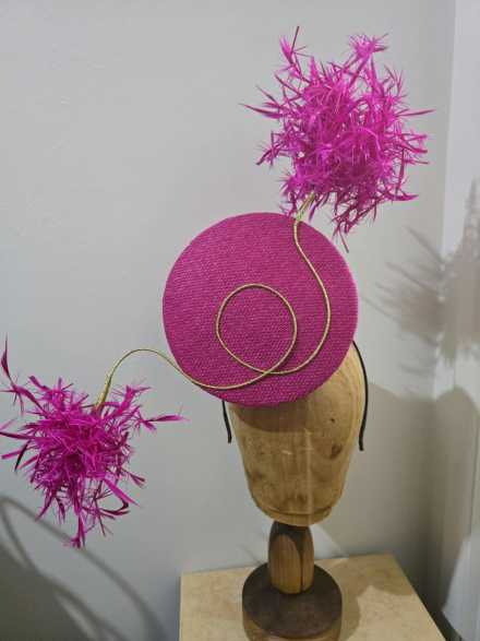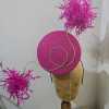 #044 Wendy White Millinery - Duchess percher in pink fabric with feather starburst.