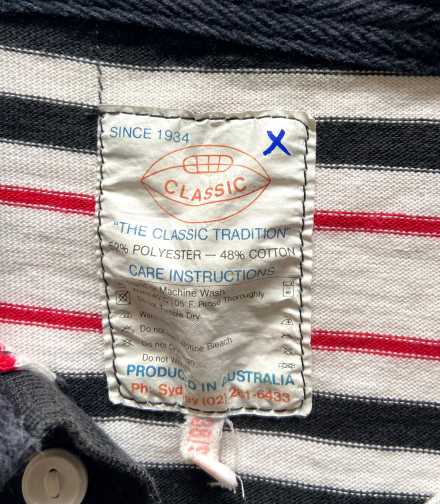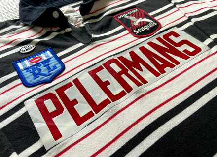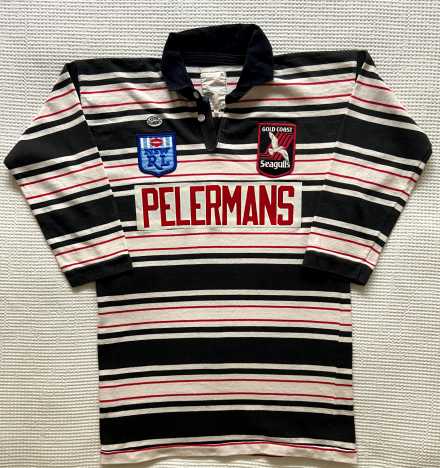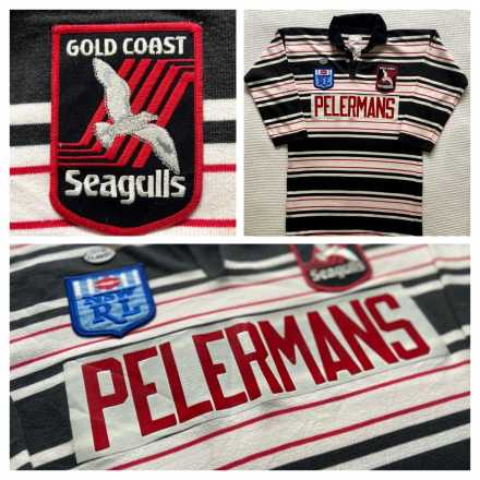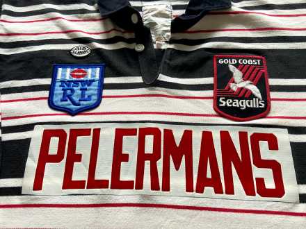 Classic original Gold Coast Seagulls jersey (not a retro remake) featuring the Pelerman’s sponsor. This piece is in excellent condition for its age. The colours remain bright, the logo print is clear and the stitching is solid throughout.