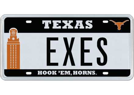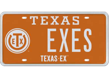 The eyes of Texas EXES are upon you! If you graduated from the 40 Acres, this as a plate for you. EXES will look great on the official Ex-Students Association of the University of Texas My Plate design. Or, perhaps you are living the life of a George Strait song, with an Eileen, Alison or a Dimples somewhere in your rear-view mirror. Whatever it may be that leads you to EXES, you will need to hang your hat in Texas to have it on your bumper. The winner of EXES gets to pick from 125+ eligible My Plates Select background designs and will have first right of renewal at then everyday pricing at expiration of the initial 5-year term.