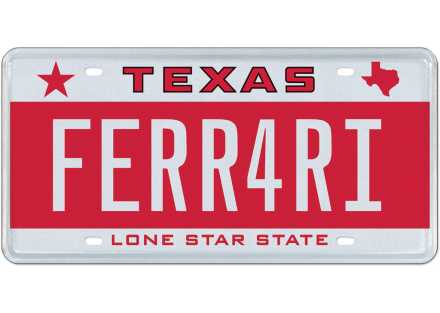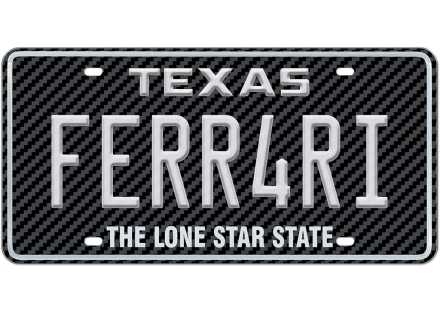 Is it a Roma? A 360 Modena? Or perhaps the newer La Ferrari or a venerable Testarossa that really revs your FERR4RI love. Anyone driving one of these famous, fast and very Italian sportscar legends deserves to have the name to match the stallion on the bumper. But only one avid enthusiast can own the only FERR4RI in Texas. To win, you must zoom right over and place your best bid! The FERR4RI winner gets to pick from 30+ eligible My Plates Select background designs and will have first right of renewal at then everyday pricing at expiration of the initial 5-year term.