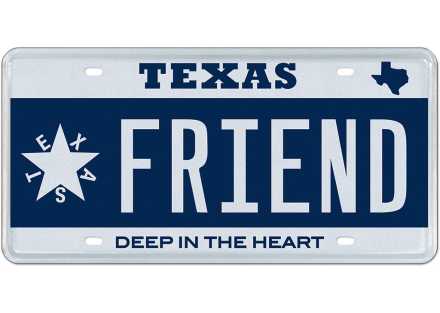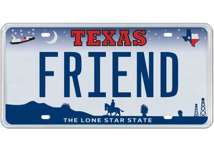 Here's a chance to make your bumper your best FRIEND. The very name of our State hails from the Caddo word for FRIEND. A super cool feature of our auction plates is you can buy and gift this plate message to a FRIEND! The subject of TV sitcoms, the one you lean on, who you do cool stuff with. A FRIEND is valuable, indeed. How much, get in on the bidding for this plate to determine the value of a FRIEND. The winner of FRIEND gets to pick from 125+ eligible My Plates Select background designs and will have first right of renewal at then everyday pricing at expiration of the initial 5-year term.