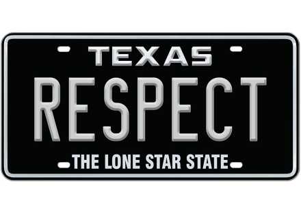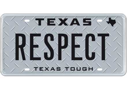 This great RESPECT plate message is easy to use on a My Plate design. Put it on a college or sports design to drive RESPECT for your team. RESPECT could go on any of our Texas-themed plates to demand RESPECT for our great state. Or RESPECT on one of our charity or organization plates will help drive attention to your cause. However you decide to display RESPECT, you can only the one to do so if you show high regard for high bidding. The winner of RESPECT gets to pick from 30+ eligible My Plates Select background designs and will have first right of renewal at then everyday pricing at expiration of the initial 5-year term.