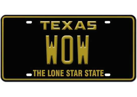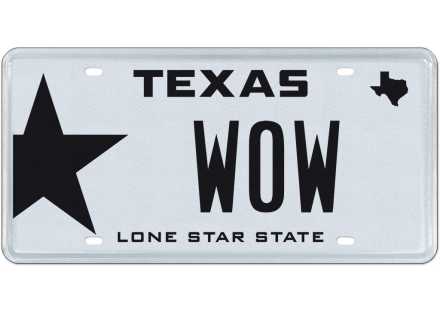 Just having the opportunity to be the sole Texan able to say WOW from their bumper should bring that very interjection out! And aside from it being just a simple but WOW message for your vehicle, it can also have a multitude of meanings. Are you a big World of Warcraft player? Do you run projects with a Way of Working? Or love to share Words of Wisdom? Up to the winner of WOW to tell us what it's all about. The winner of WOW gets to pick from 125+ eligible My Plates Select background designs and will have first right of renewal at then everyday pricing at expiration of the initial 5-year term.