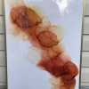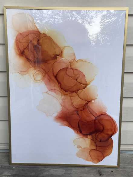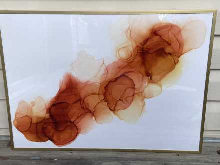 An abstract painting in warm orange tones creates a sense of movement and lightness. It will become a vibrant accent and bring coziness to any modern interior. Framed size 28" x 20". May be displayed in any direction.