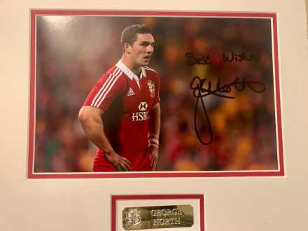 This signed photo of George North from the 2013 British and Irish Lions tour in Australia, features the famous Welsh winger. The tour was marked by North's unforgettable tackle, where he lifted Israel Folau onto his back—an iconic moment now legendary in Lions history.