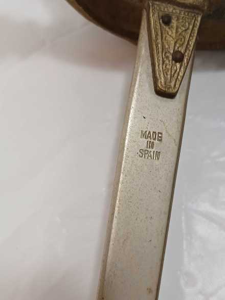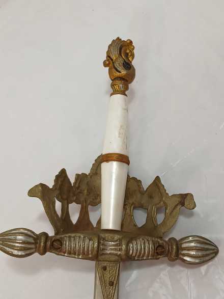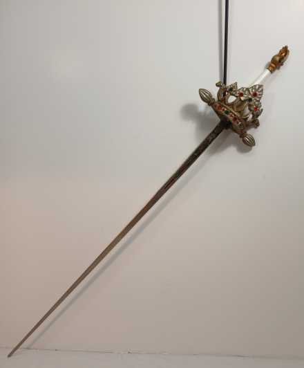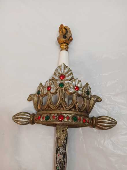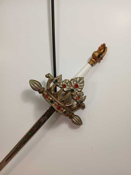 "Ladies" replica sword. Blade Measures 27-3/4", overall length 34". Hand guard is crown shape and studded with faux jewels. Handle is is faux quartz. Pommel is shaped like a dragon or a swan. Blade is etched. Marked "Made in Spain".
