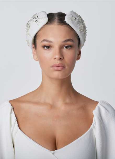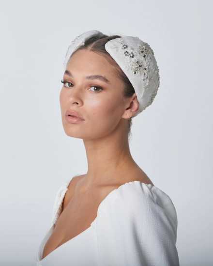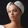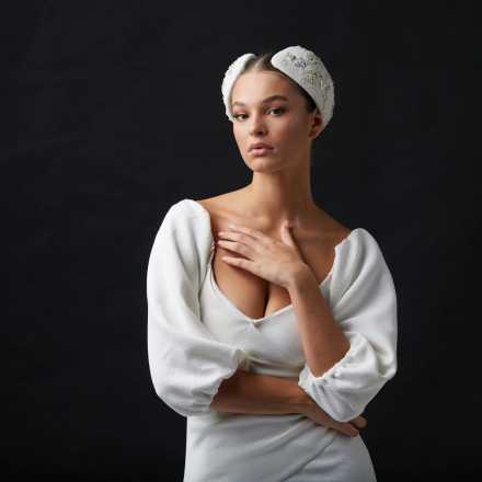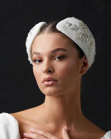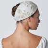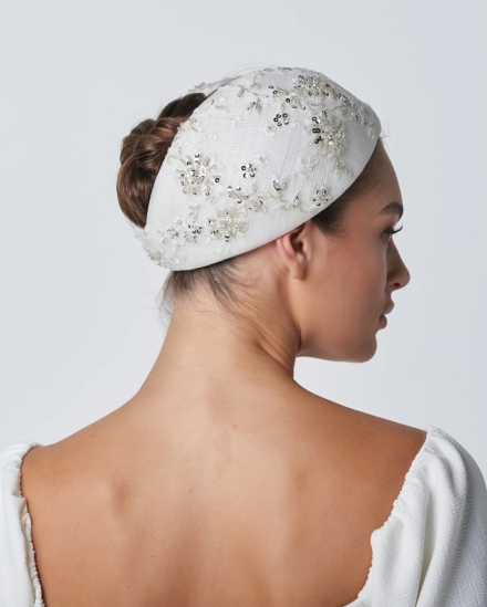 THE BEAUTY WITHIN – First time offered for sale! The inspiration for this piece came from an open pearl oyster. Just like an oyster surrounds the beautiful pearl within it, this stunning piece surrounds the wearer’s beauty. It's what's inside that counts. The delicate beaded lace, individually hand-cut and hand-sewn to the surface of the sinamay, creates a shimmery, sparkly effect when kissed by the light. This piece represents timeless elegance, making the wearer look & feel beautiful. Perfect for FOTF, race-wear, evening-wear, formal-wear, bridal-wear and special events. Sinamay construction, fully lined with attachment via small combs on either side.
