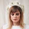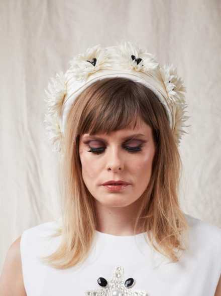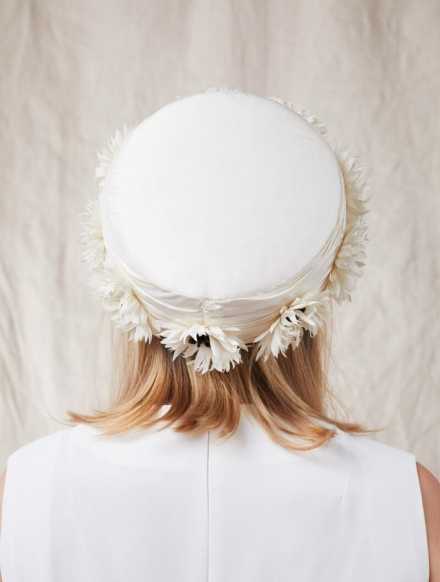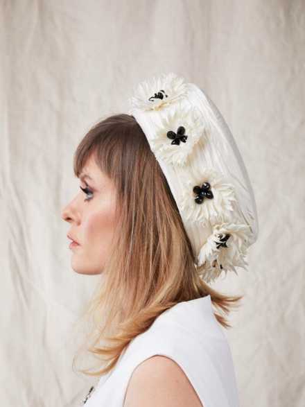 Silk pillbox with hand sculpted, pleated sides, trimmed with handmade silk flowers with black Swarovski centres.
