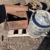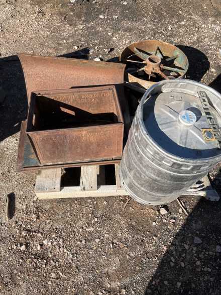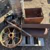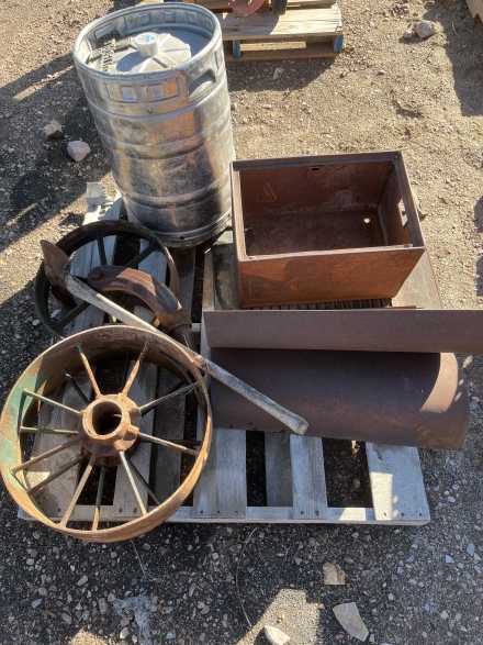 Antique wheels, beer keg, model T hood. Antique beer box, etc.