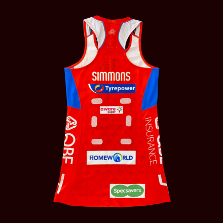 Celebrate the creativity and flair of the Swifts midcourt with this official 2025 NSW Swifts match kit dress featuring the name of Verity Simmons.