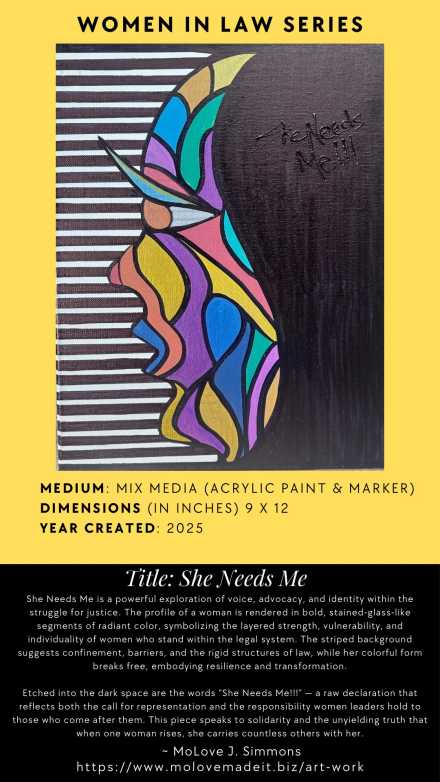 She Needs Me is a powerful exploration of voice, advocacy, and identity within the struggle for justice. The profile of a woman is rendered in bold, stained-glass-like segments of a radiant color, symbolizing the layered strength, vulnerability, and individuality of women who stand within the legal system. The striped background suggests confinement, barriers, and the rigid structures of law, while her colorful form breaks free, embodying resilience and transformation.