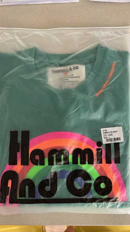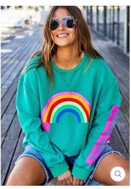 An absolute essential, this effortless vintage wash sweat is featured in a slouchy, crewneck silhouette with multi coloured rainbow print on the front and bold hot pink Hammill & Co logo down the left sleeve. Embroidered hot pink HAPPY VIBES, HAPPY LIFE around the rib collar. Each garment has had a heavy wash to give the vintage-inspired faded look. Soft 100% Washed Cotton fleece Refer to images https://cathammill.com.au/products/vintage-rainbow-sweat-jade?_pos=1&_si...