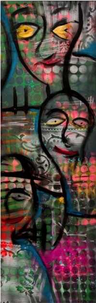 "Part of the “Holiday Friends Series”, “Friendly Strangers” is completely intuitive. These street art inspired pieces look at the people I see intuitively in my mind. Strong black outlines coupled with vibrant colours create a playful sense of freedom and the fact that many strangers feel friendly even though they’re unknown."