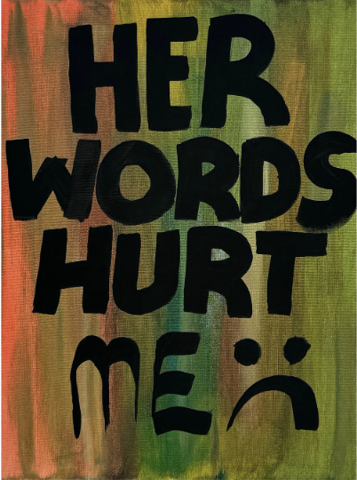 This artworks is another mysterious artwork created by an anonymous artist. The bold words of 'Her Words Hurt Me' leave nothing but a burning desire to know more. The artwork raises question and slight concern as to why the artist has chosen to share this., relaying conflicted emotions to its viewers.
