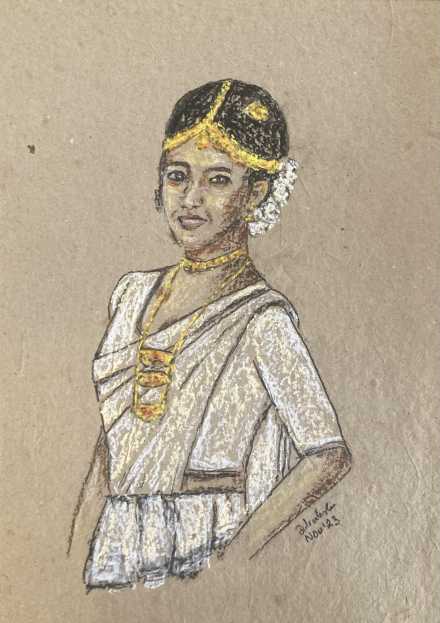 This work is influenced by my upbringing in Sri Lanka and many cherished memories of attending weddings of friends and family. The bride wears Sri Lankan Kandyan wedding attire although I have deliberately changed the necklaces to be somewhat non-traditional as a nod to the bride's modern life whilst she wears attire of ages past. The three tier necklace is likely to have been a family heirloom passed down through many generations. The sari she wears is draped in a traditional "Osariya" style. The paper for the work used is made in Sri Lanka and as such I felt it was the appropriate surface for the subject. A wedding for me is an expression of hope and I feel the bride's expression conveys that anticipation as she looks into the future. This work is unframed.