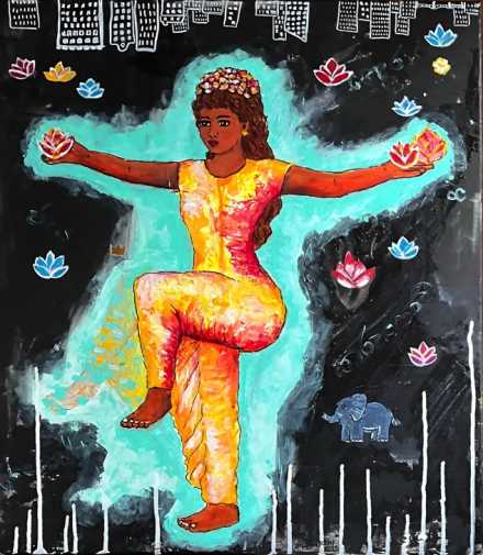 A dancer in motion: embodying resilience amid upheaval. The inverted cityscape and upward-flowing white drips symbolize a world turned upside down, yet the dancer remains poised and luminous. Lotus flowers float around her, evoking transcendence and spiritual awakening, while a singular white and gold bloom hints at joy and new beginnings. A small elephant anchors the composition, representing strength and resilience. Words for bravery, compassion, hope, and victory in Sinhala script weave in faintly, underscoring a message of perseverance, hope and grace under pressure. Part of a broader series with the theme hope- the dancer knows that this turmoil too shall pass.