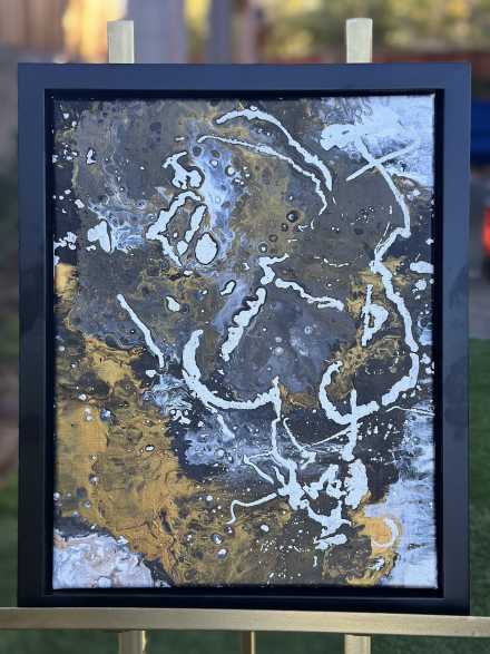 A striking 12x16 abstract composition blending metallic gold, silver, and deep black hues with ethereal white outlines. This artwork evokes a sense of cosmic wonder, as if peering into the ever-changing patterns of the universe. The textured fluidity and celestial tones bring depth and movement, making it a captivating centerpiece for any modern space.
