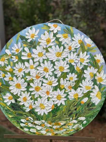 This cheerful acrylic palette knife, circular painting bursts with the charm of blooming daisies, their white petals and sunny yellow centers set against a lush green background. The textured strokes bring a lively, almost three-dimensional quality to the piece, evoking the freshness of a spring meadow under a clear blue sky. The round canvas adds a unique touch, making this artwork an uplifting celebration of nature's simplicity and joy. A perfect addition to brighten any space with its vibrant energy.