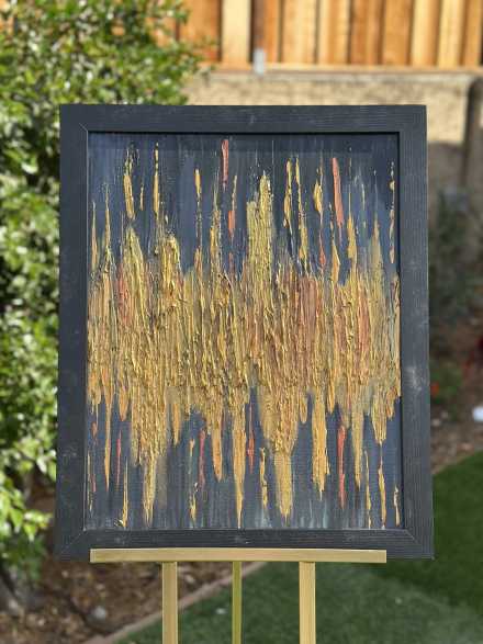 This bold and textured painting captures the essence of cascading gold, with streaks of metallic hues flowing dynamically against a deep black background. The interplay of warm golds, coppery reds, and subtle greens creates a mesmerizing visual rhythm that evokes both energy and elegance. The tactile quality of the thick brushstrokes adds depth and movement, making this artwork a stunning statement piece that radiates sophistication and warmth. Perfect for modern and abstract art enthusiasts.