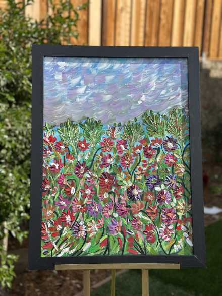 This vibrant 18X24 acrylic palette knife painting celebrates the beauty of a blooming meadow, bursting with colorful wildflowers in shades of red, purple, pink, and white. The lush greenery and textured petals bring life and movement to the composition, while the soft, swirling sky above adds a serene and dreamy quality. The layered brushstrokes create depth, immersing the viewer in the joy and energy of a sunlit field. A lively and uplifting piece, perfect for bringing the beauty of nature indoors.