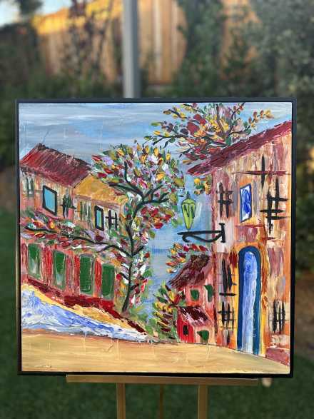 This vibrant 20X20 palette knife oil painting captures the essence of a Mediterranean village with its rustic architecture, colorful facades, and charming cobblestone pathways. The bold red roofs, lively trees bursting with autumnal hues, and the serene blue doorway draw the viewer into a world of timeless charm. The textured strokes and dynamic composition evoke the warmth and spirit of a tranquil coastal town. Perfect for anyone who cherishes the romance of travel and the beauty of quaint, picturesque settings.