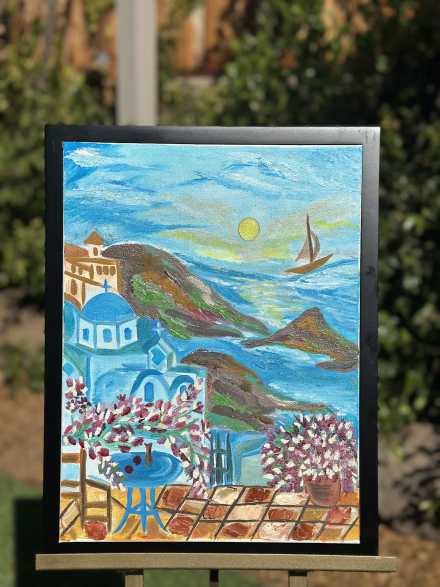 This captivating oil painting captures the essence of a peaceful Mediterranean escape. Its vibrant hues and rich textures invite you to a sunlit terrace overlooking sparkling blue waters, framed by iconic whitewashed architecture and lush blooms.