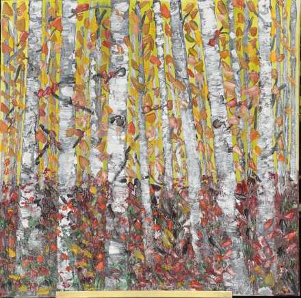 This 24x24 vibrant oil painting captures the timeless beauty of an aspen grove at the peak of autumn. The textured palette knife technique brings to life the golden yellows and fiery reds of the leaves, contrasting with the silvery-white bark of the trees. The rich layers of color create depth and movement, inviting viewers to lose themselves in nature's quiet sanctuary. This piece symbolizes renewal and hope and is a perfect addition to any space.