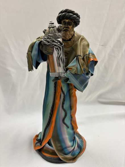This striking sculpture features a rabbi or biblical figure wearing a vibrant, multicolored robe