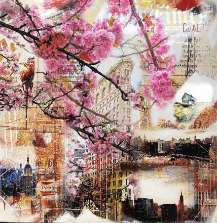 The purpose of this piece, like all my works, is above all an aesthetic reflection of my inner self, my character, and my pursuit of creating beauty. It is a process of producing works that are beautiful and inspiring, with a unique technique that is distinctly mine. In the end, the artwork is a reflection of my character. This one is particularly special because it was created during a period in my life when I was immersed in a very urban environment, now blended with a more human mindset, thanks to the cherry blossoms! Two periods of different techniques, two different states of mind.
