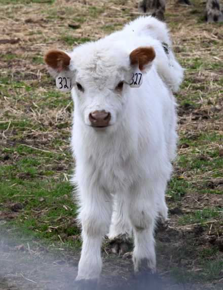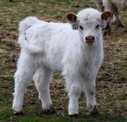 Buffy is a white polled Highway calf. Sired by WCC Pretty Boy, she’s got that hair and structure we breed for, with a clean-polled head and that fuzzy Highland x Galloway look that turns heads.