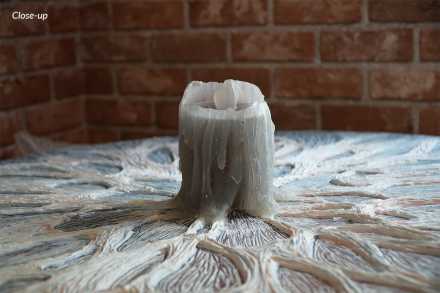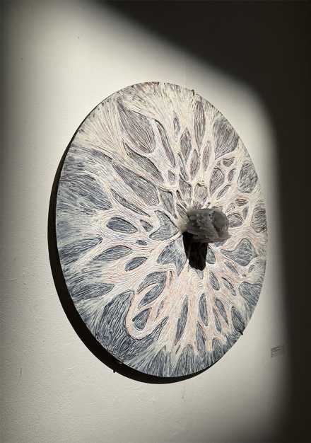 “Afterlight” refers to lingering emotions after a beautiful moment. Carved from soap — which naturally degrades over time — a burning candle sits in the centre, evoking visuals of a sundial, symbolising the ceaseless passage of time. It melts into a network of lines, representing the traces time leaves. Subtle blue and orange hues represent day and night, suggesting time’s continual movement. The work captures time’s impermanence, a reminder to cherish life’s moments before they come to pass.