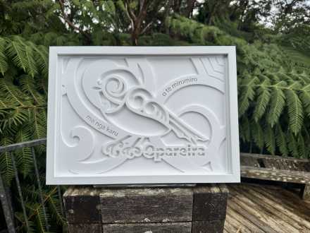Within our ngahere the ritual passing of the day plays with the depth of light that is seen through the eyes of our kaitiaki, te Miromiro. Feathered in tuxedoed black and white, our Miromiro flitters between these darkened shades and the contrasting shafts of day. This visual doppler has been re‑formed in laminated acrylic, cut and layered to create a contrast of grey tones that shift and pause as light passes and perspective changes — a synthetic reflection of a simple natural process.