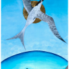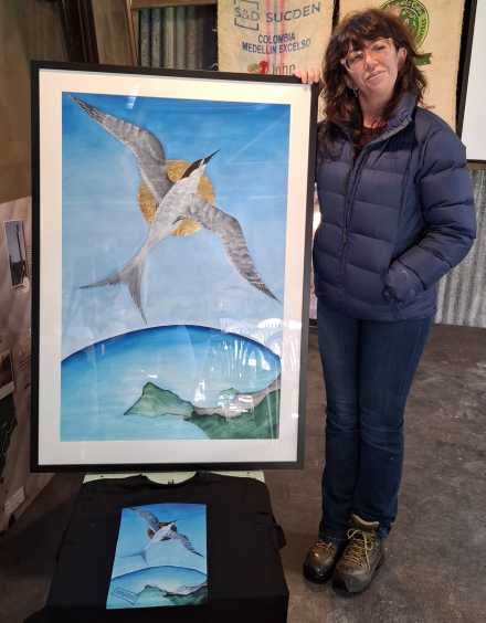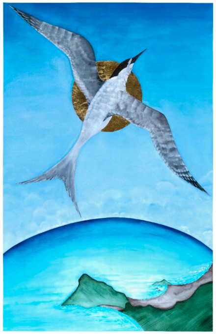 Auckland-born artist and Waitākere local, Celeste Strewe, award-winning for her body and makeup artistry, brings her sculptural eye and attention to detail to this work. The White-fronted Tern (Tara) is highlighted as a vulnerable species, alongside the delicate habitat it depends on. The landscape is depicted from above, reflecting the tern’s perspective and its deep connection to the environment, while the sun, rendered in gold, emphasizes this fragility and leaves a bold, iconic impression. Through her lyrical, imaginative style, Strewe celebrates native species and fragile ecosystems, inviting reflection on our role as kaitiaki.