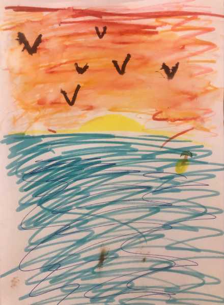 #053 Eleanor H., age 9 3/4, Seascape with birds at sunrise, 2024