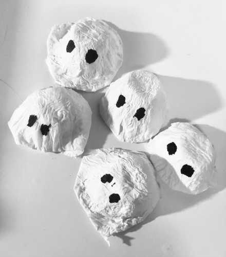 Handmade paper sculptures, set of 5, each 6 x 6 x 3 cm.