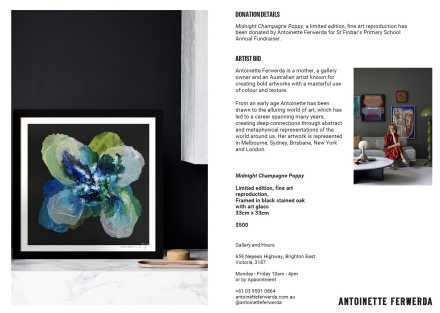 Local artist Antoniette Ferweda has kindly donated a stunning artwork called 'Midnight champagne Poppy'. This limited edition fine art is framed in black stained oak.