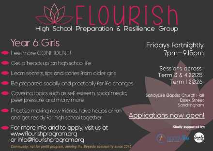 "The Flourish Program" would love to donate one voucher to our Year 6 2025 (or Year 6 2026) High School Preparation and Resilience Program. This unique program will prepare your daughter for secondary school, make them feel more confident, build their self esteem and provide opportunities to practice making new local friends
