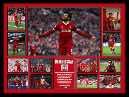 Celebrate the brilliance of Mohamed Salah with this premium limited edition framed print, featuring 13 vivid images capturing iconic moments in his Liverpool career. Central to the display is a striking action of Salah himself featuring a facsimile printed signature.
