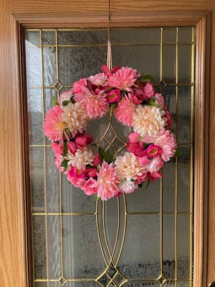 Beautiful spring wreath crafted by Jean Swiderski. 15 inches in diameter with cord for hanging.