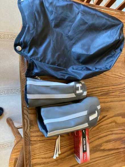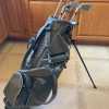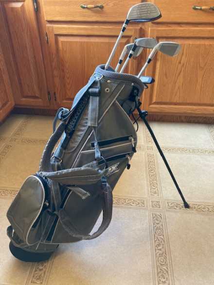 Junior golf bag with five clubs. Bag has carry strap and stand. Clubs included are driver, five wood, seven iron, wedge and putter. Brand name is TPX by Powerbuilt. CLUBS WERE USED ON 2-3 OCCASIONS. All gear in like new condition.