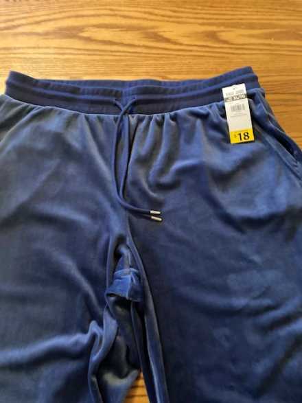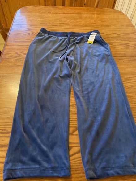 "My Style" soft comfortable lounge pants. Drawstring waist, two pockets, attractive blue in color, size XL. 94% polyester and 6% spandex. Machine Washable.