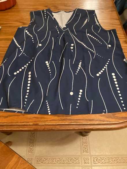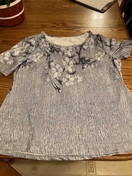 Two ladies tops. One sleeveless, navy blue background with white dots and lines. 100% polyester. Second top has short sleeves, blue gray background with flowers. Temu size XXL, Canadian size medium to large. 95% polyester and 5% elastene.