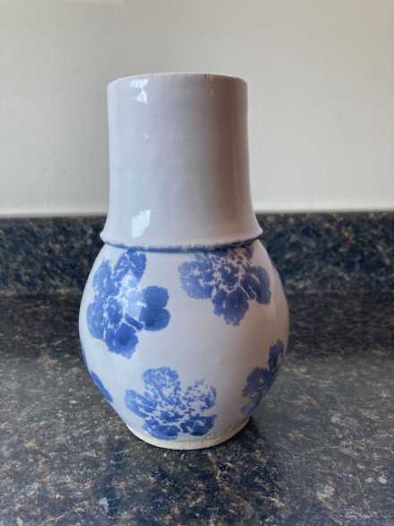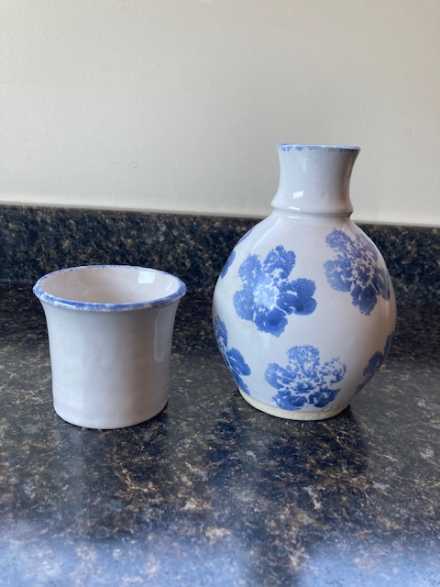 Handcrafted pottery bottle and cup. Bottle measures 6.5 inches. Made in Cape Breton at The Homestead.