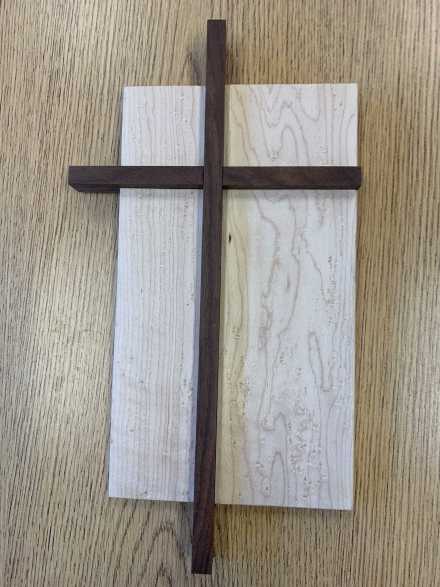 This hand crafted cross is made of walnut and bird's-eye maple. This would make a meaningful gift for confirmation, graduation, or a wedding, or a beautiful addition to your home.