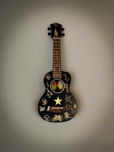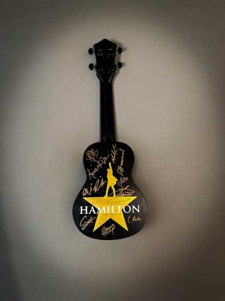 This revolutionary ukulele is hand-painted in the spirit of Hamilton, with stunning detail inspired by the show's iconic imagery and color palette. Signed by the current Broadway cast, this one-of-a-kind piece honors the legacy of Hamilton with music, art, and purpose. A true collector’s item for fans of history, hip-hop, and musical theater.