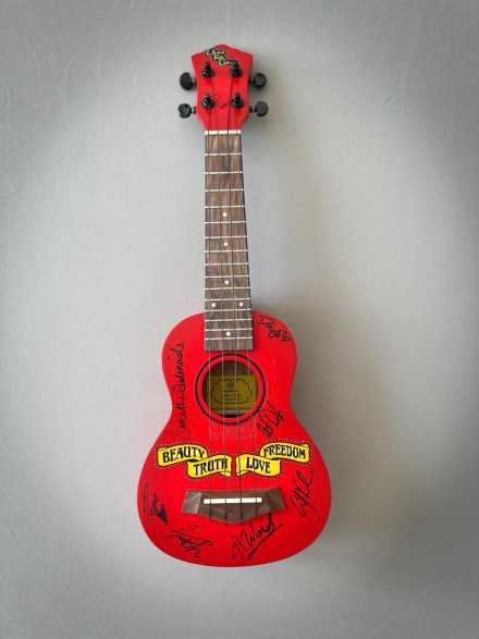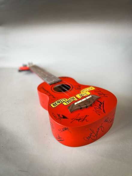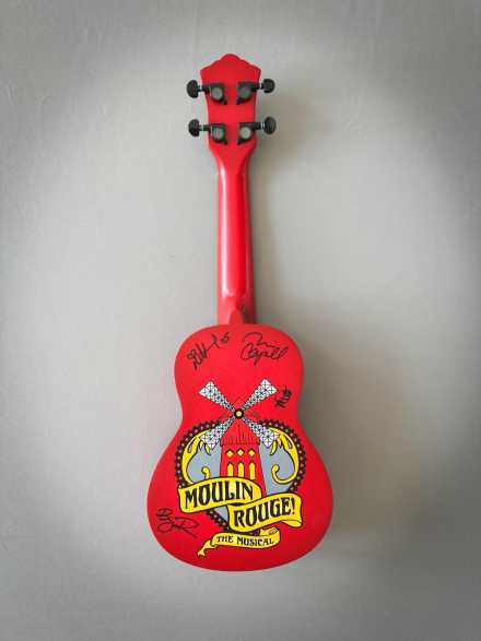 Painted with flair, sparkle, and bohemian beauty, this Moulin Rouge! ukulele bursts with color and cabaret charm. Featuring cast signatures from the current Broadway production, this instrument captures the spirit of truth, beauty, freedom, and love — making it a show stopping piece of Broadway magic.